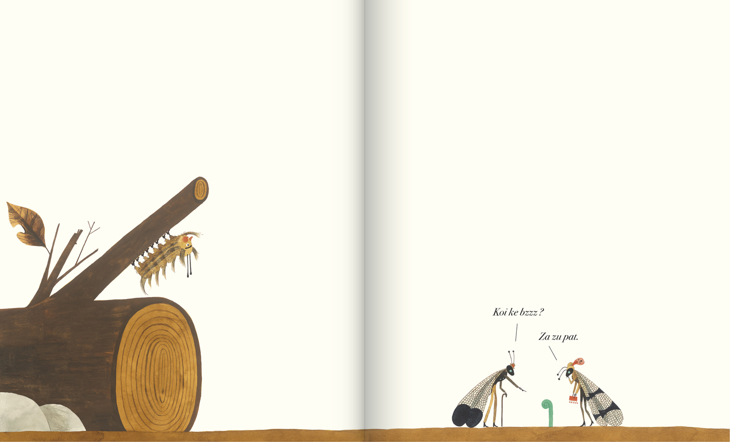 Le langage n’est jamais aussi jubilatoire que lorsqu’il est digressif. Il n’est jamais aussi digressif que lorsqu’il est inventé. Cet album passionnant est rédigé en parler insecte. Et le lecteur, même s’il ne parle pas couramment cette langue, se réjouit de comprendre ce qui se joue parmi ces petits animaux. Adjoints aux images limpides et poétiques, le texte est d’une finesse et d’un humour remarquables !