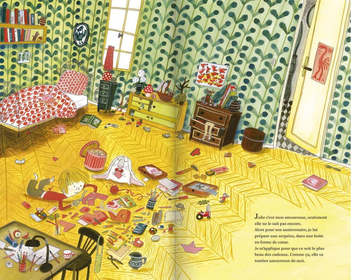 Dans un univers coloré à dominante de vert, jaune et rouge, Benjamin Chaud décline des graphismes variés sur des tapisseries, des tissus, des végétaux. Son univers est, comme de coutume, accueillant, douillet, souriant.